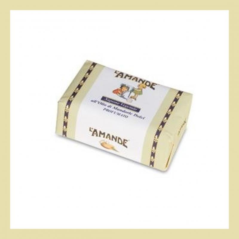La saponetta vegetale di L'Amande viene venduta in una confezione interamente in carta che contiene 200 grammi di prodotto.